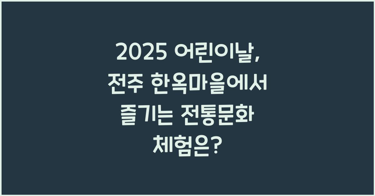 2025 어린이날, 전주 한옥마을에서는 다양한 전통문화 공연과 전시도 계획되어 있습니다. 한국의 전통 음악과 무용은 물론, 퓨전 공연까지 다양한 경험이 기다리고 있습니다. 이러한 프로그램은 아이들과 함께 한국의 전통 예술을 즐길 수 있는 훌륭한 기회입니다.
